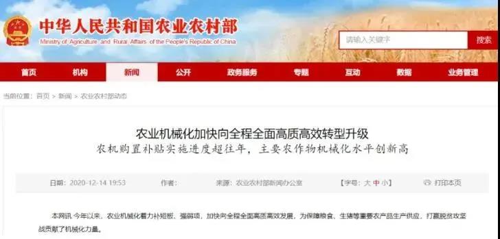 ? ? 農(nóng)業(yè)農(nóng)村部網(wǎng)站近日消息,今年以來,農(nóng)業(yè)機(jī)械化著力補(bǔ)短板、強(qiáng)弱項(xiàng),加快向全程全面高質(zhì)高效發(fā)展,為保障糧食、生豬等重要農(nóng)產(chǎn)品生產(chǎn)供應(yīng),打贏脫貧攻堅(jiān)戰(zhàn)貢獻(xiàn)了機(jī)械化力量。