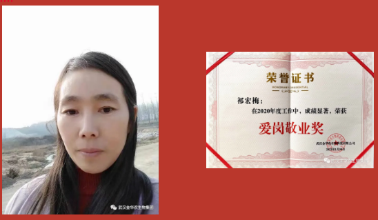 ? ? 祁紅梅在2020年生產(chǎn)工作中,勤勉務(wù)實(shí)、恪盡職守,圓滿完成公司各項(xiàng)生產(chǎn)任務(wù)。5年來,她扎根一線,從不拈輕怕重,對(duì)待工作,積極主動(dòng),她以務(wù)實(shí)的工作作風(fēng),樹公司品牌形象,為公司發(fā)展壯大貢獻(xiàn)力量,獲評(píng)“愛崗敬業(yè)獎(jiǎng)”。她的敬業(yè)和擔(dān)當(dāng)精神值得全體武漢金華農(nóng)家人學(xué)習(xí)!