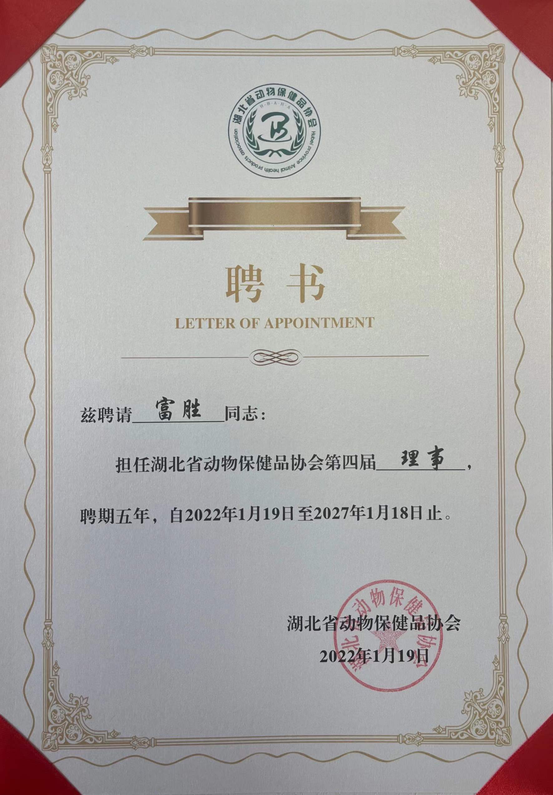 大會上,武漢金華農(nóng)富勝董事長榮聘“湖北省動物保健品協(xié)會”理事職位,并頒發(fā)聘任證書。在會議上,富勝董事長發(fā)表了精彩致辭。