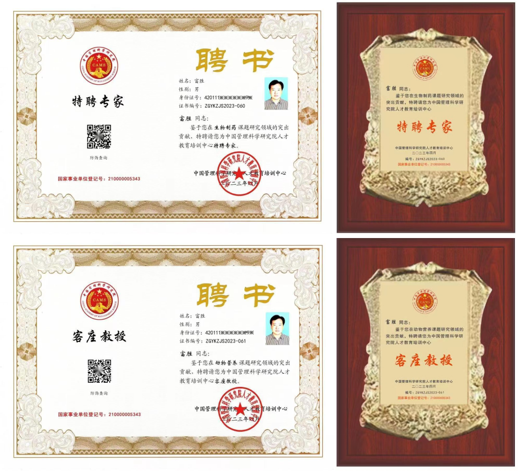 鑒于武漢金華農(nóng)生物科技有限公司在“動保生物制藥”與“動物營養(yǎng)”領(lǐng)域的影響力和杰出貢獻,經(jīng)研究決定,特授予富勝董事長『中國管理科學研究院特聘專家』、『中國管理科學研究院客座教授』兩項榮譽。