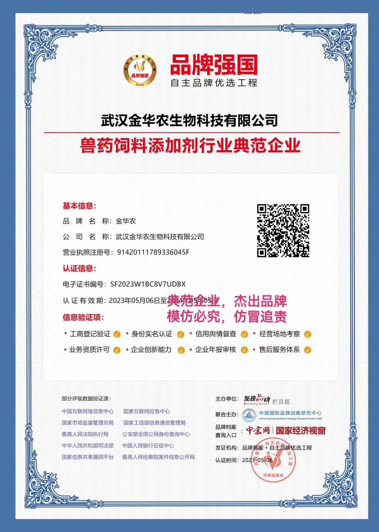 近日,武漢金華農(nóng)生物科技有限公司經(jīng)過資質(zhì)審核、輿情監(jiān)控等層層篩選,成功入選品牌強國·自主品牌優(yōu)選工程,并被評為“獸藥飼料添加劑典范企業(yè)”。企業(yè)信息將錄入品牌強國優(yōu)選工程數(shù)據(jù)庫,在國家級平臺向公眾展示品牌形象。
