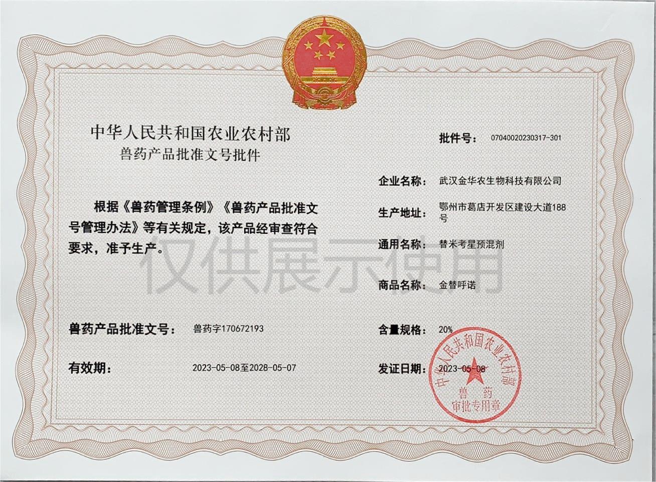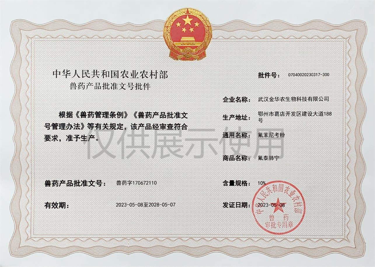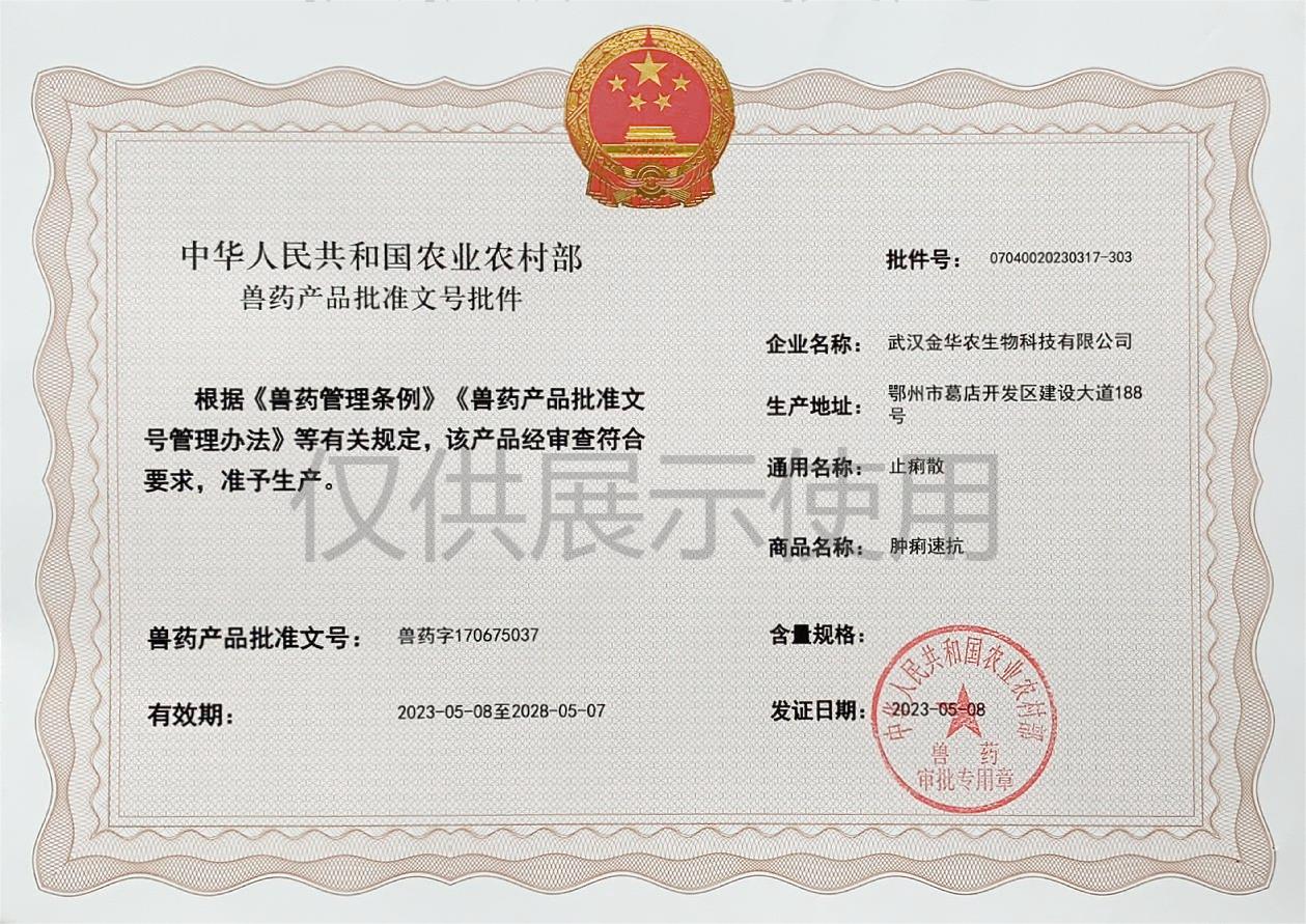 根據《獸藥管理條例》和《獸藥產品批準文號管理辦法》的規(guī)定,經國家農業(yè)農村部審查,準予核發(fā)武漢金華農生物科技有限公司(以下簡稱“武漢金華農生物”)國家新版GMP獸藥相關產品批準文號。