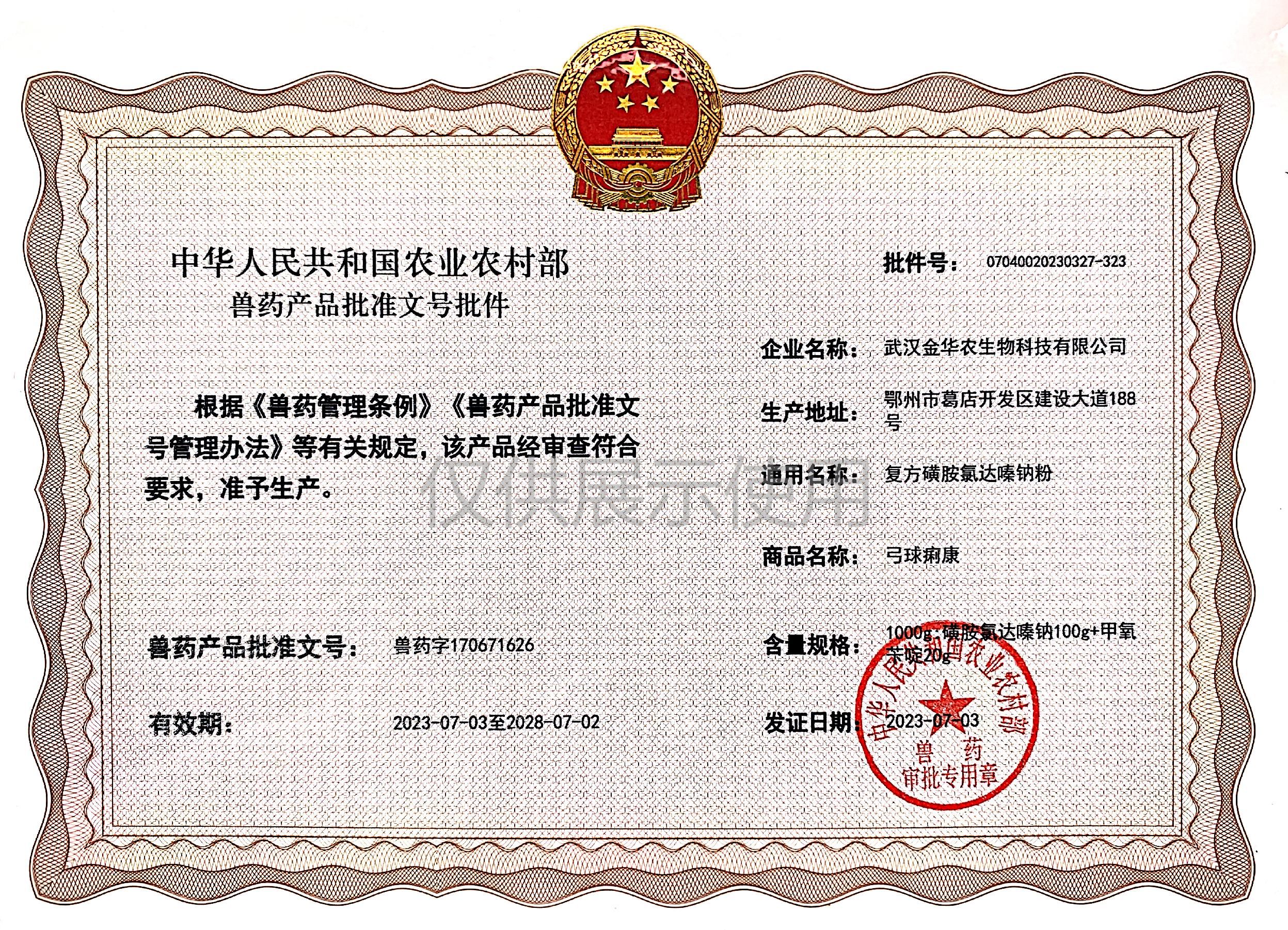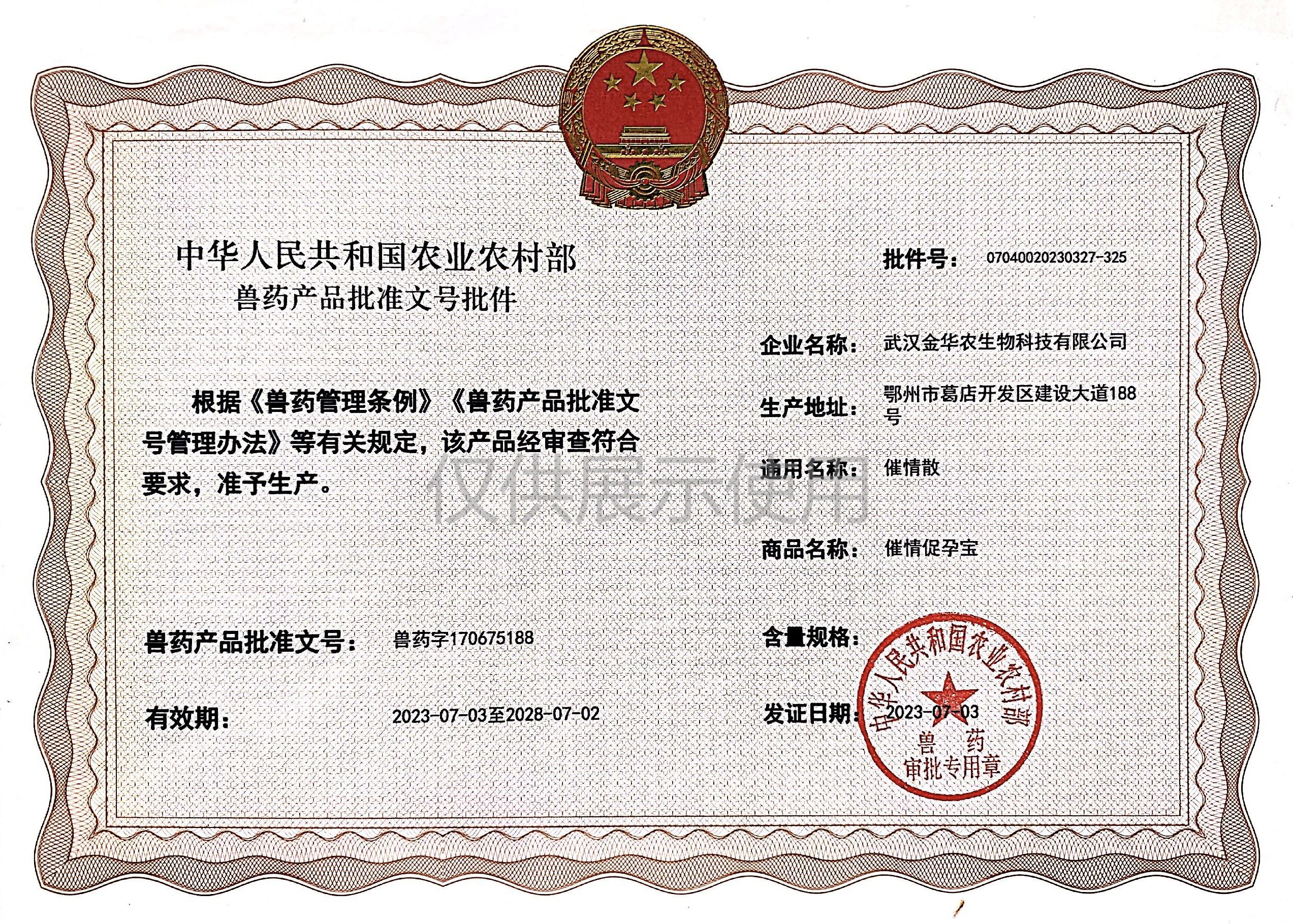 根據(jù)《獸藥管理?xiàng)l例》和《獸藥產(chǎn)品批準(zhǔn)文號(hào)管理辦法》的規(guī)定,經(jīng)農(nóng)業(yè)農(nóng)村部審查,準(zhǔn)予核發(fā)武漢金華農(nóng)生物科技有限公司(以下簡稱“武漢金華農(nóng)生物”)國家新版GMP9種獸藥相關(guān)產(chǎn)品批準(zhǔn)文號(hào),這是今年獲取的第三批獸藥產(chǎn)品批準(zhǔn)文號(hào),截至目前,我司已獲得農(nóng)業(yè)農(nóng)村部頒發(fā)的新版GMP獸藥文號(hào)20個(gè)。