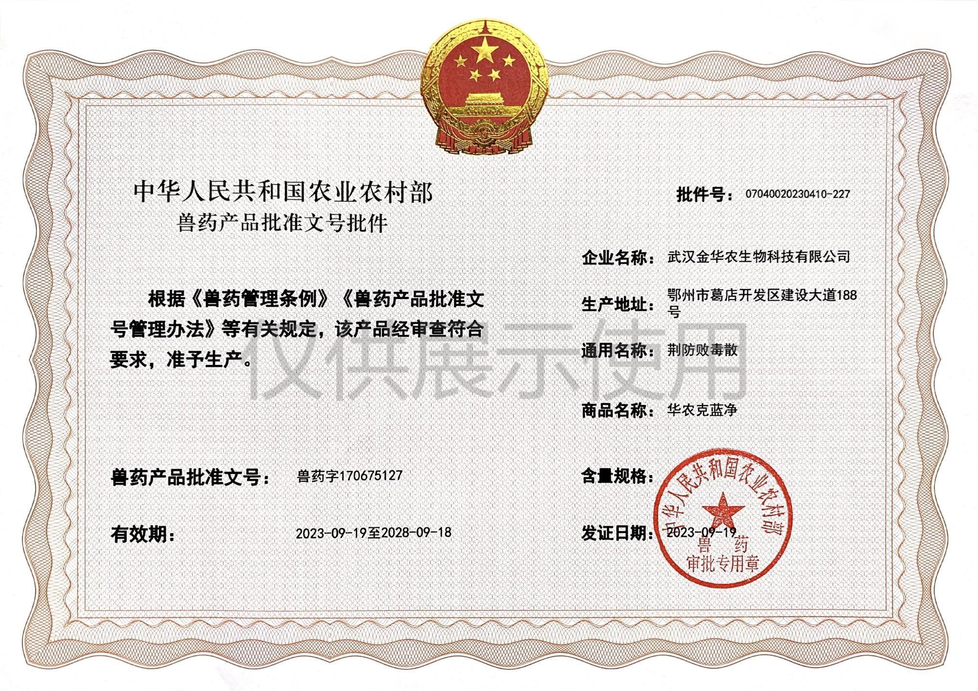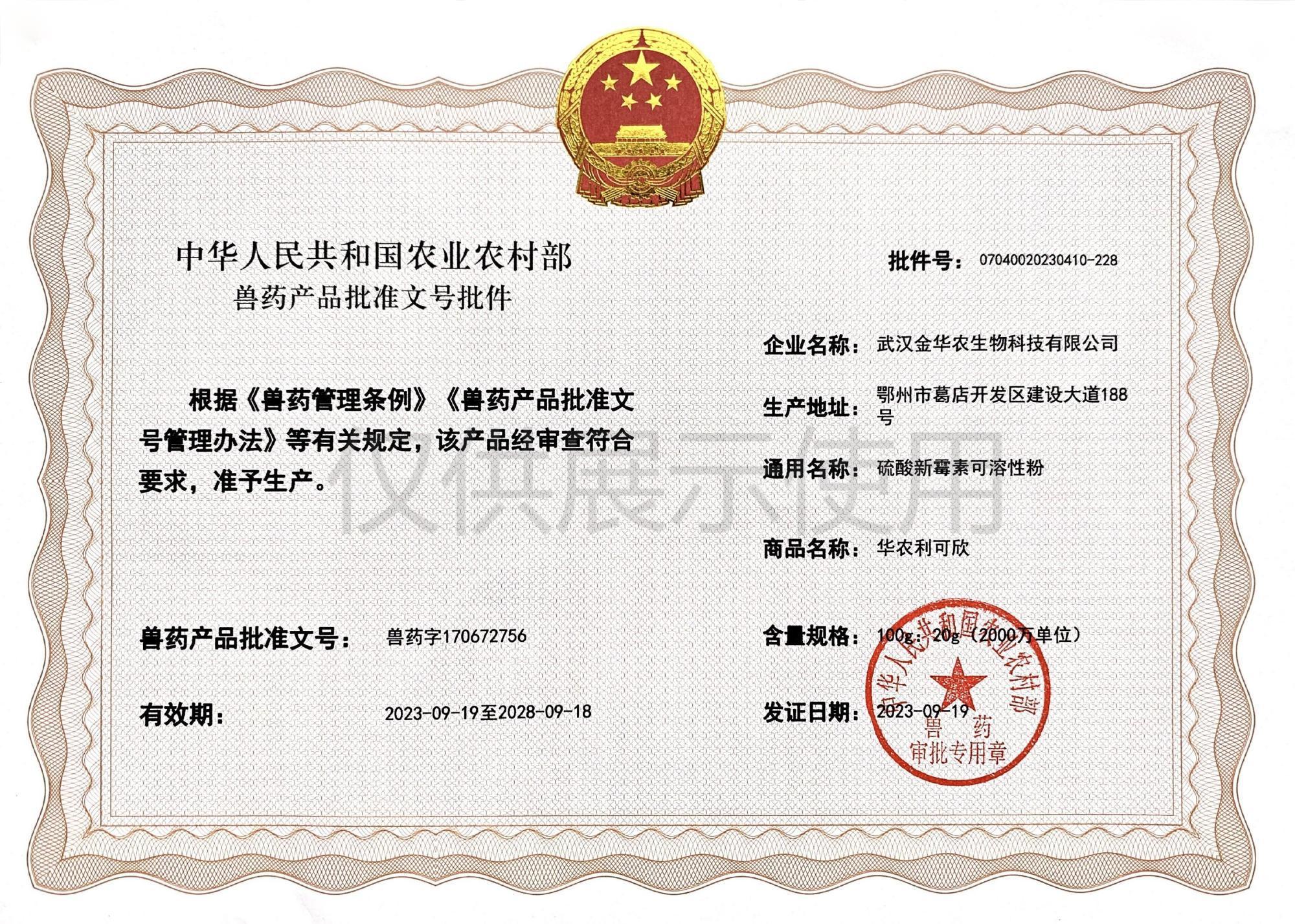 近日,我司申報(bào)的新獸藥“華農(nóng)感康靈”(荊防敗毒散)、“華農(nóng)利可欣”(20%硫酸新霉素可溶性粉)正式獲批,并獲得國農(nóng)業(yè)農(nóng)村部頒發(fā)的新獸藥產(chǎn)品批準(zhǔn)文號批件。