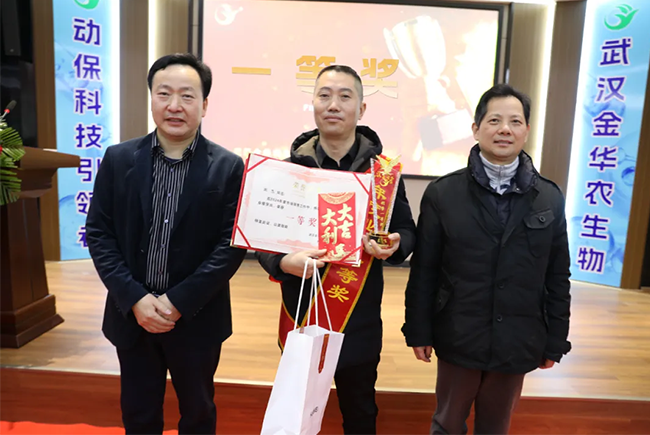 頒獎(jiǎng)嘉賓:武漢金華農(nóng)生物集團(tuán)董事長(zhǎng)富勝、中國(guó)銀行華中農(nóng)業(yè)大學(xué)支行行長(zhǎng)高婕、武漢金華農(nóng)副總經(jīng)理黃凡