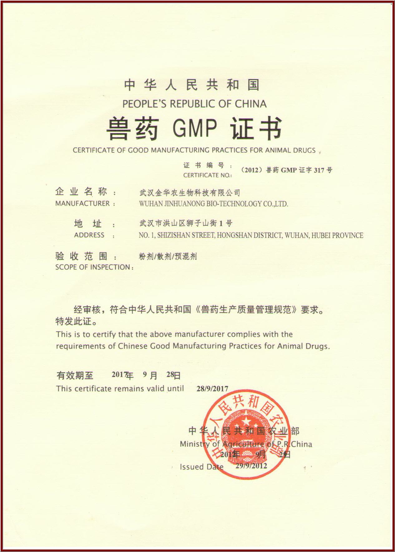 ??2012年9月28日、29日,武漢金華農(nóng)獲國(guó)家農(nóng)業(yè)部頒發(fā)雙證---【(2012)獸藥GMP證字317號(hào)】和獸藥生產(chǎn)許可證【(2012)獸藥生產(chǎn)證字17048號(hào)】同期到達(dá),雙喜生輝!