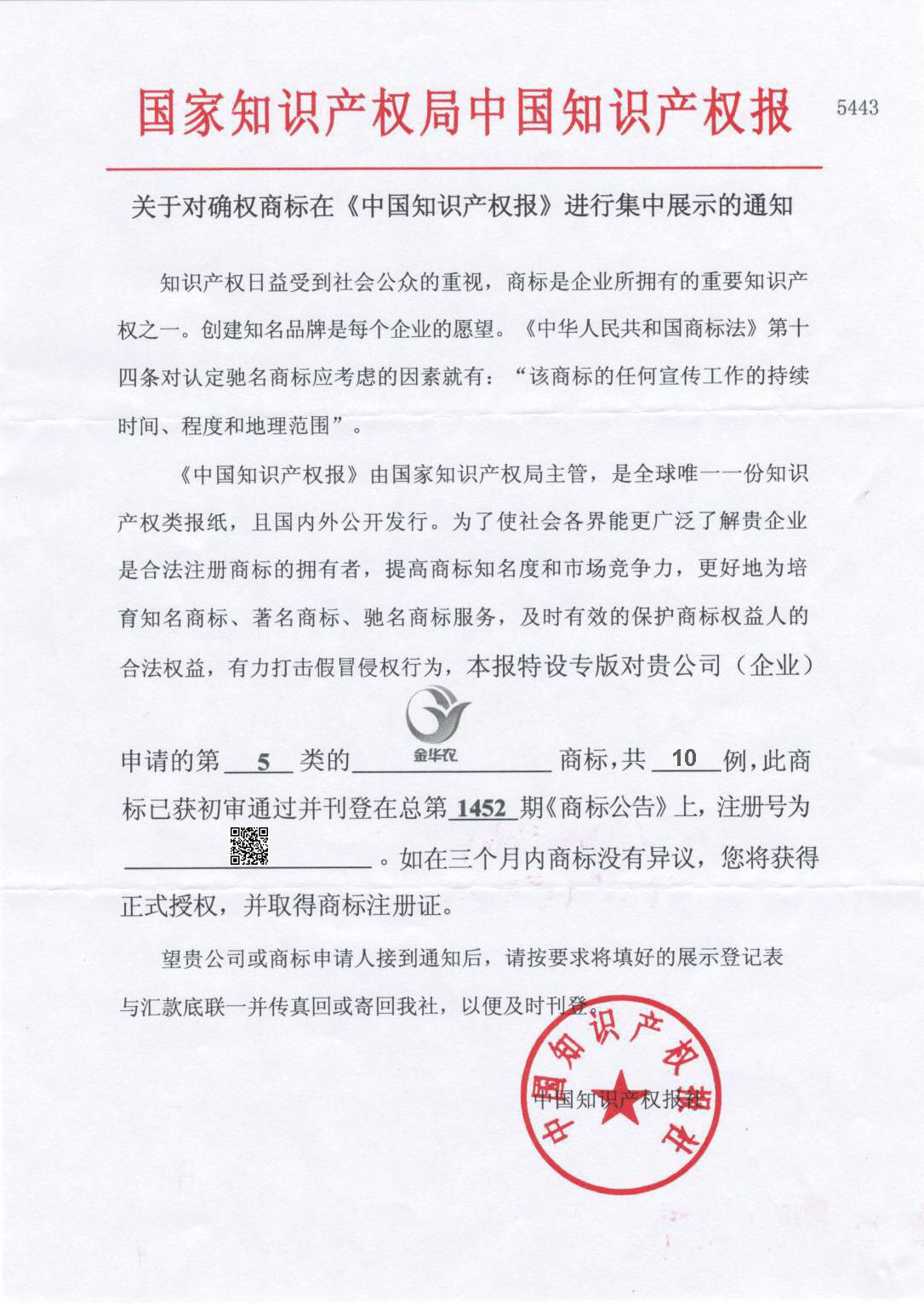 7月22日, 武漢金華農(nóng)生物喜獲國家工商總局頒發(fā)“馳名商標”認證。經(jīng)國家知識產(chǎn)權(quán)局授權(quán),中國知識產(chǎn)權(quán)報、中國商報社聯(lián)合對武漢金華農(nóng)生物品牌戰(zhàn)略規(guī)劃、馳名商標事項等進行專題報道。