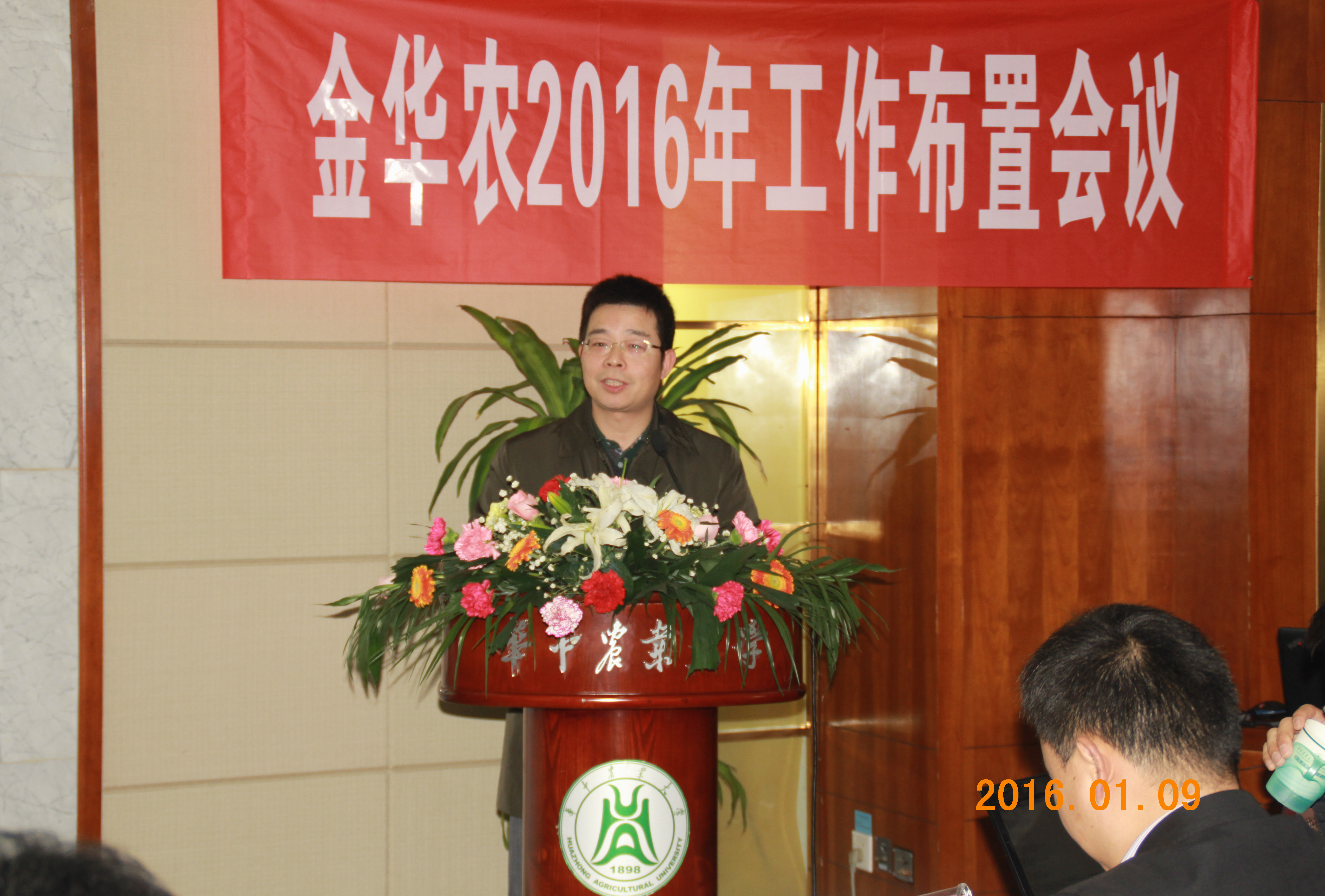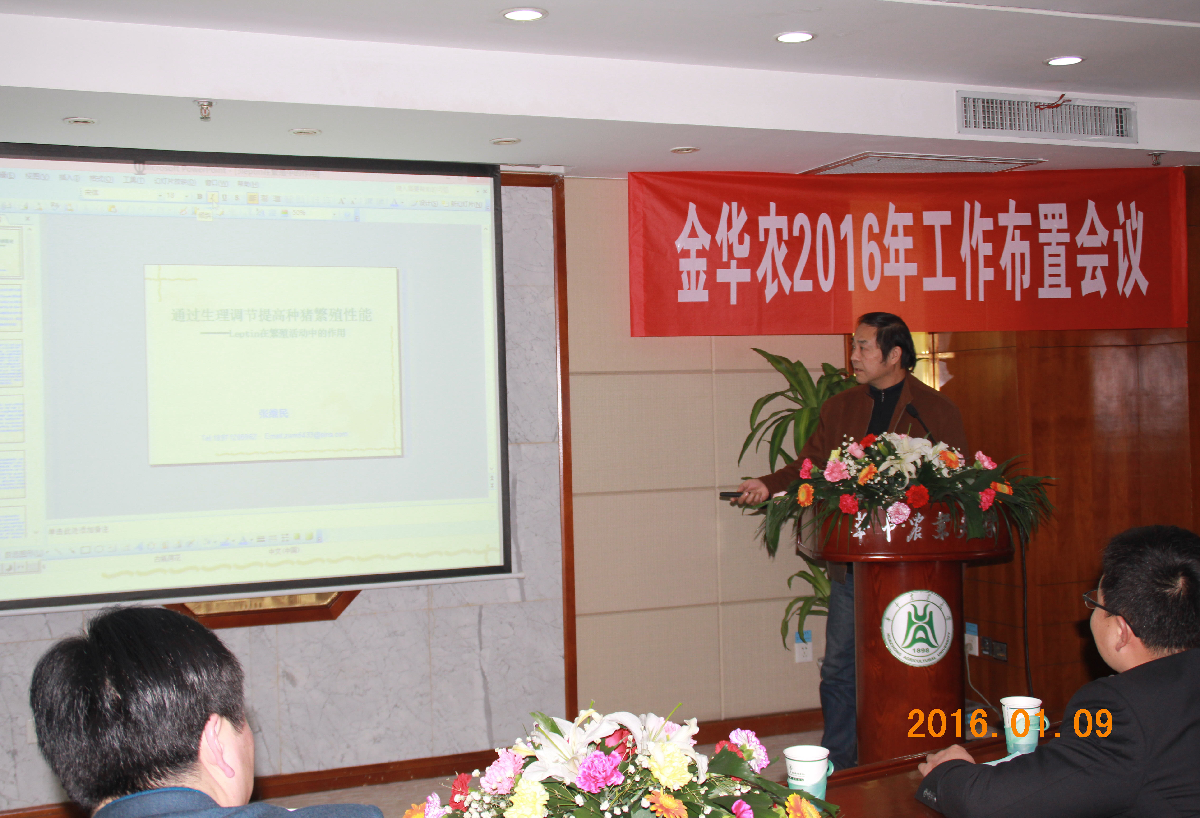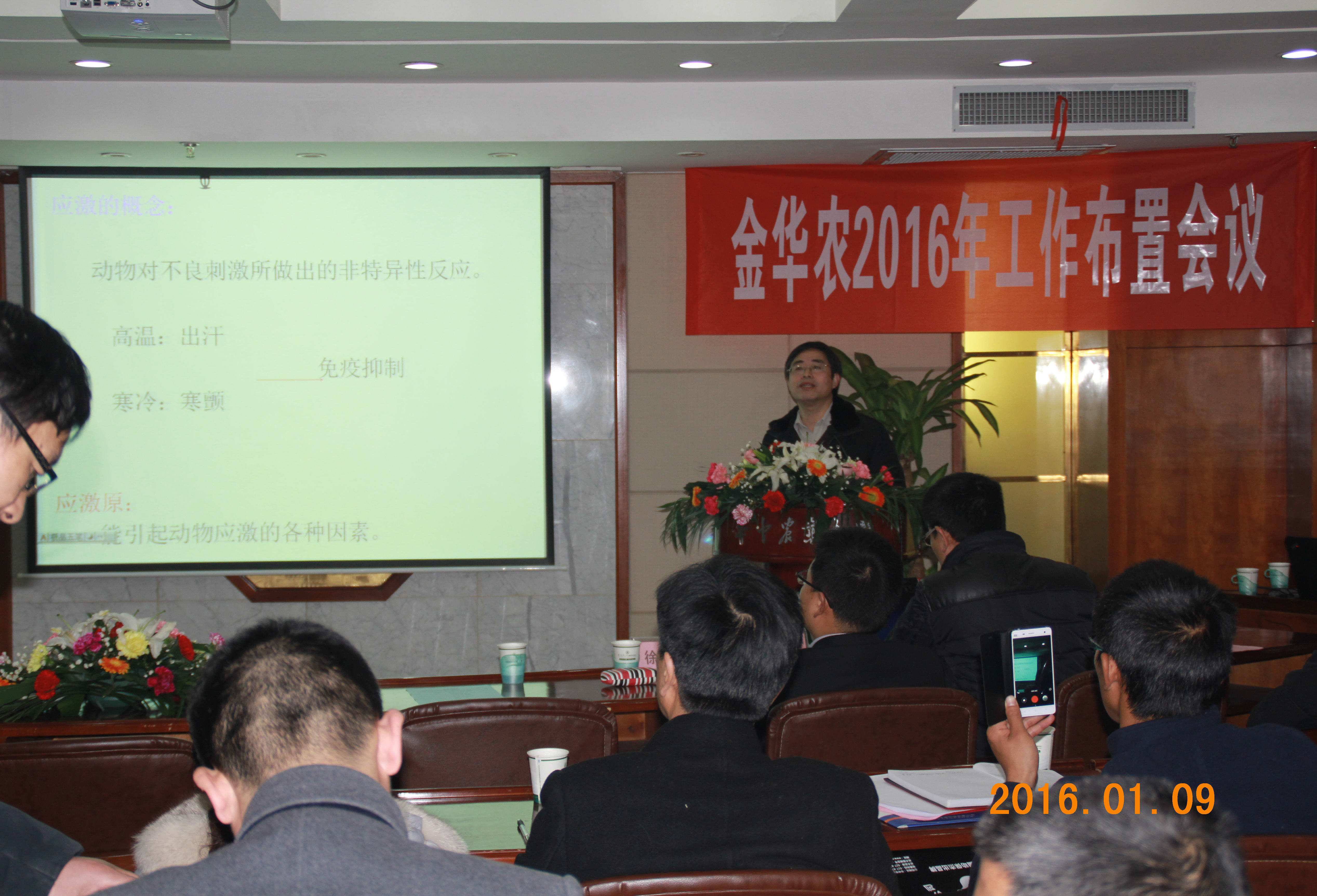 1月9日上午,華中農(nóng)業(yè)大學(xué)動物醫(yī)學(xué)院黨委書記劉興斌書記、華中農(nóng)業(yè)大學(xué)附校黨委書記李仁剛書記、華中農(nóng)業(yè)大學(xué)人事處龍健飛處長、華中農(nóng)業(yè)大學(xué)畜牧獸醫(yī)臨床專家張維民教授、華中農(nóng)業(yè)大學(xué)動物飼料營養(yǎng)專家齊德生教授、湖北電視臺農(nóng)業(yè)頻道毛記者一行來到校內(nèi)國際學(xué)術(shù)交流中心,隆重出席并參加武漢金華農(nóng)生物2015年終工作總結(jié)及表彰大會,并向公司致賀。