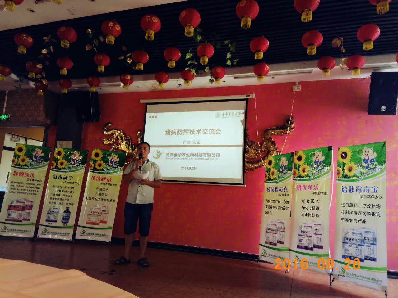 9月27-28日,公司廣西市場“秋冬季豬病防控研討會”勝利召開!本次會議由公司領導常務副總徐巍博士做企業(yè)介紹及公司“一三五”戰(zhàn)略發(fā)展規(guī)劃,公司技術部唐友琦老師主講,玉林北流地區(qū)負責人曹玉廣經(jīng)理策劃與組織?,F(xiàn)場客戶40多人參加會議,雖然很多都是新客戶,但是使用武漢金華農(nóng)產(chǎn)品后,都覺得產(chǎn)品質量過硬,臨床效果十分顯著,豬病技術服務十分優(yōu)秀,會議最后大家激情都很高,贏得一片片喝彩掌聲,會議取得良好的效果,當場收現(xiàn)金7萬多元,預計后期拜訪總銷量達12萬以上!祝賀優(yōu)秀新人-曹玉廣經(jīng)理首戰(zhàn)告捷!