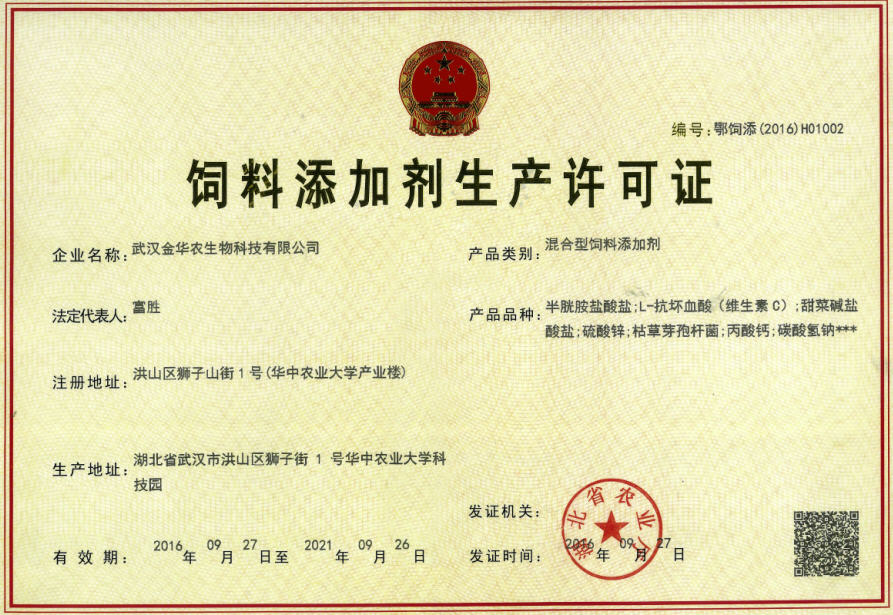 2016年10月16,武漢金華農(nóng)生物科技有限公司在湖北省農(nóng)業(yè)廳喜獲國家農(nóng)業(yè)部頒發(fā)的“新一代”飼料添加生產(chǎn)許可證,武漢金華農(nóng)生物于2016年9月份接受國家農(nóng)業(yè)部、湖北省農(nóng)業(yè)廳的雙重驗收,并以高分一次性通過國家農(nóng)業(yè)部專家組審查驗收,公司此次榮譽獲得的“新一代”飼料添加劑生產(chǎn)許可證書(含蓋:微生物制劑生產(chǎn)許可證、益生菌生產(chǎn)許可證),證書編號為【鄂飼添(2016H01002號】。