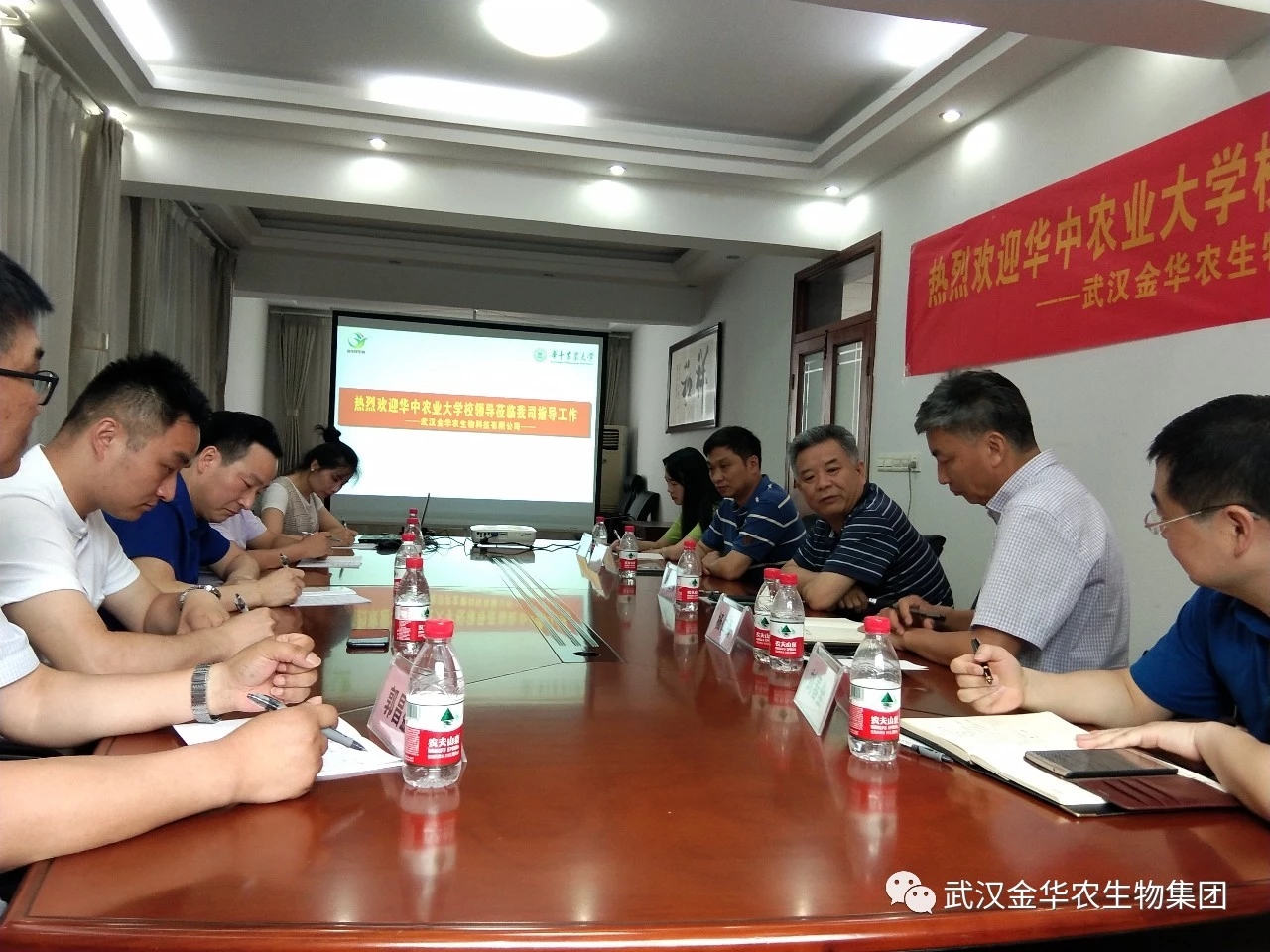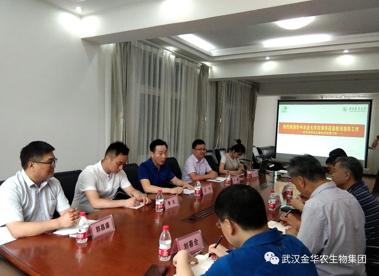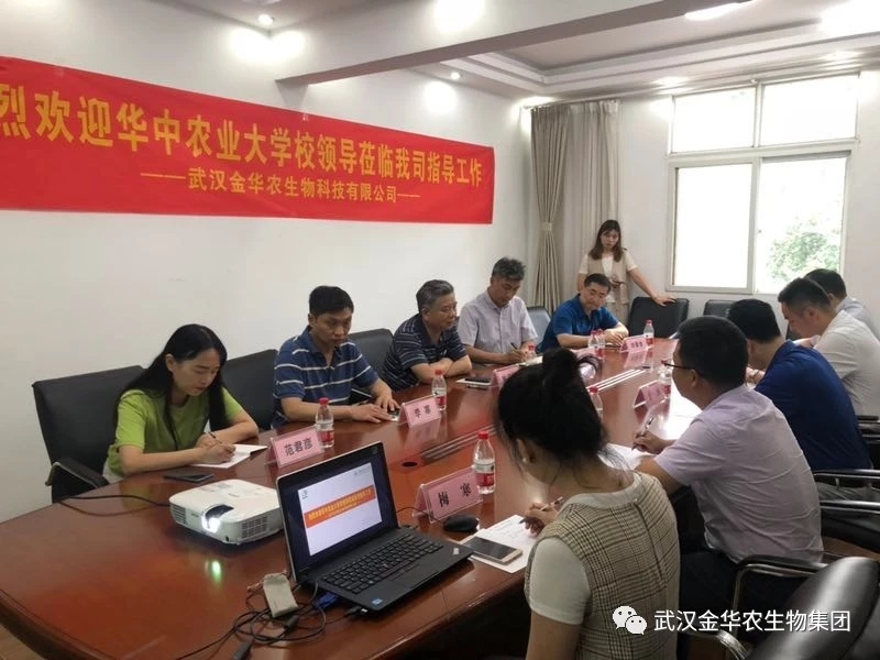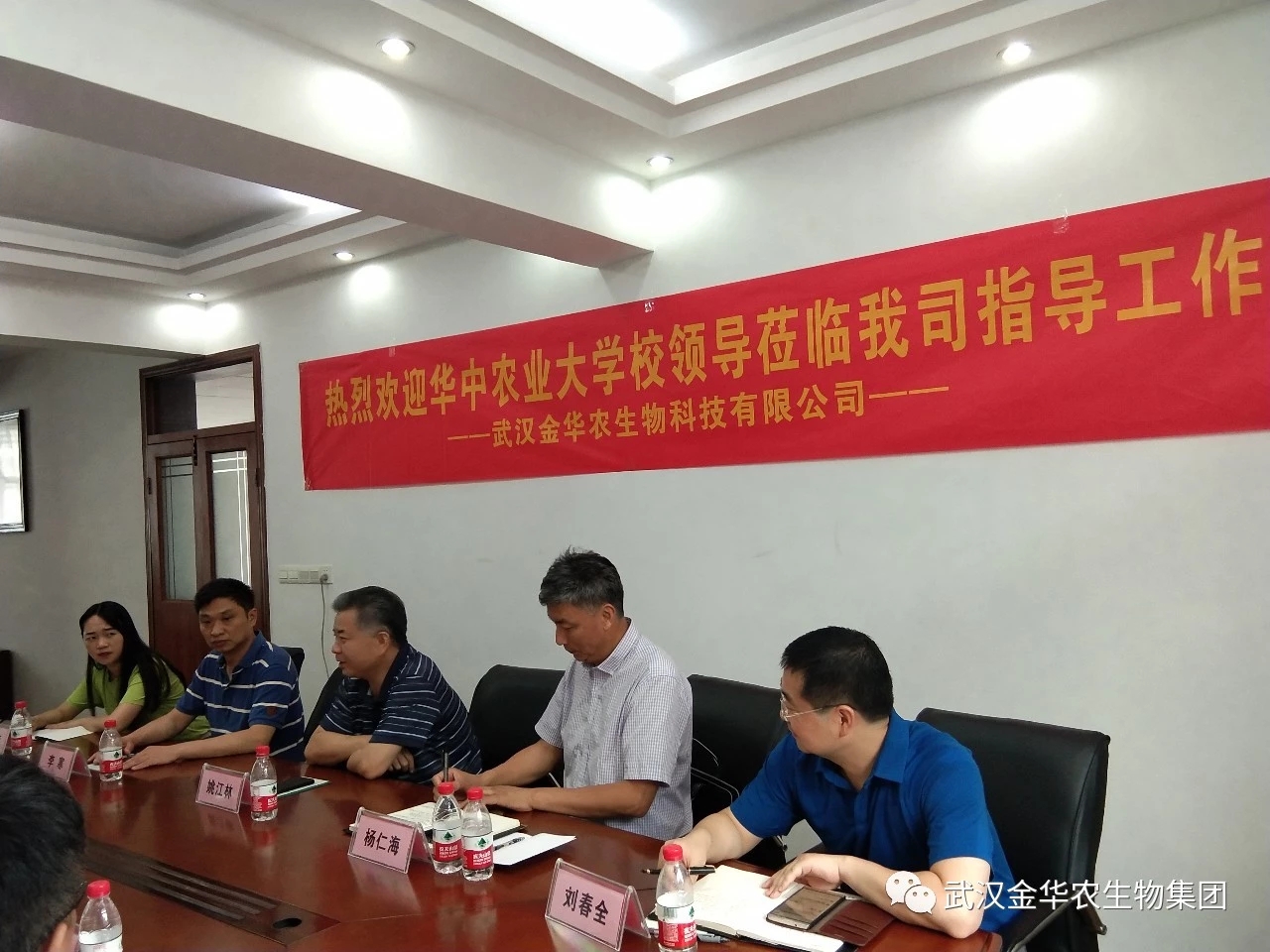 2019年6月12日,華中農(nóng)業(yè)大學(xué)黨委副書記、副校長(zhǎng)姚江林,華中農(nóng)業(yè)大學(xué)資產(chǎn)經(jīng)營(yíng)與后勤保障部部長(zhǎng)李寒,華中農(nóng)業(yè)大學(xué)校友與基金工作辦公室主任楊仁海,華中農(nóng)業(yè)大學(xué)資產(chǎn)經(jīng)營(yíng)與后勤保障部副部長(zhǎng)劉春全,一行4人蒞臨武漢金華農(nóng)生物科技有限公司,就雙方深入開展校企聯(lián)合等工作進(jìn)行會(huì)談交流。