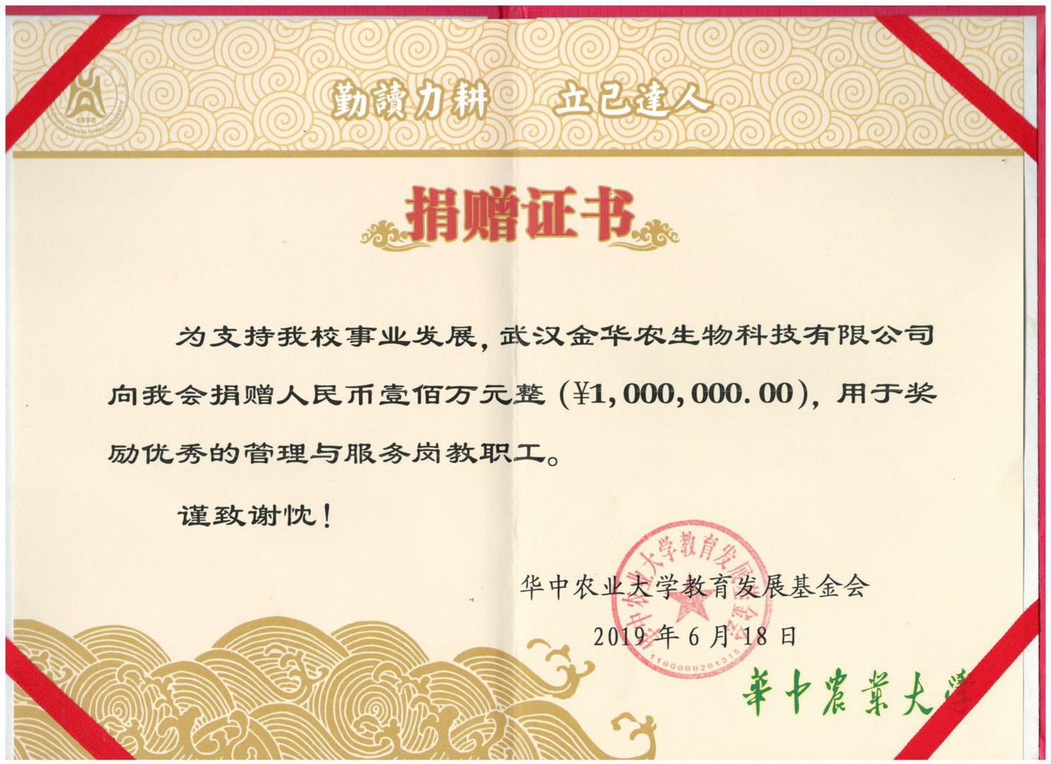 華中農(nóng)業(yè)大學(xué)向武漢金華農(nóng)生物頒發(fā)捐贈證書